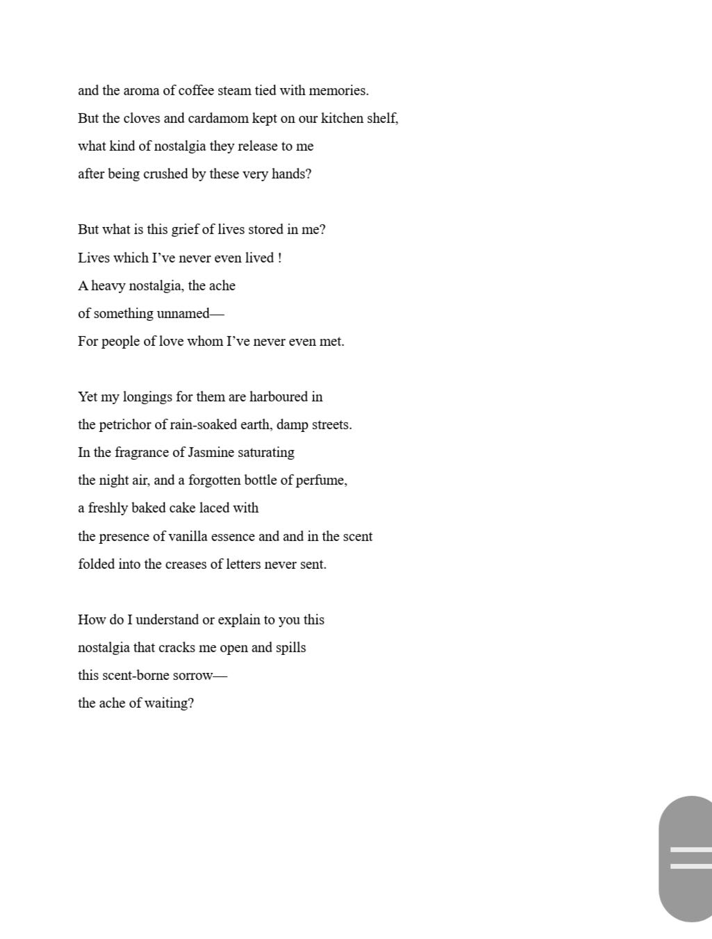 A smell slips straight into the residence of memories. Memory is not just what we choose to remember, but also what chooses to return to us. This is why the scent of an old sweater might make one cry without knowing why. Grief, then, becomes something olfactory, something that lives even in the air.